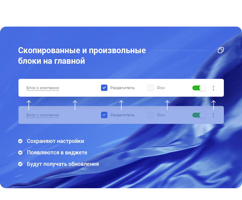 Создавайте произвольные блоки на главной, чтобы показать все преимущества. Берите за основу любой из типов отображения баннеров или блока о компании. Скопированный блок сохранит настройки, появится в виджете и будет получать улучшения из обновлений. Вы также можете использовать блок с главной для произвольной верстки. Он будет отображаться в виджете для управления: перемещения или отключения.