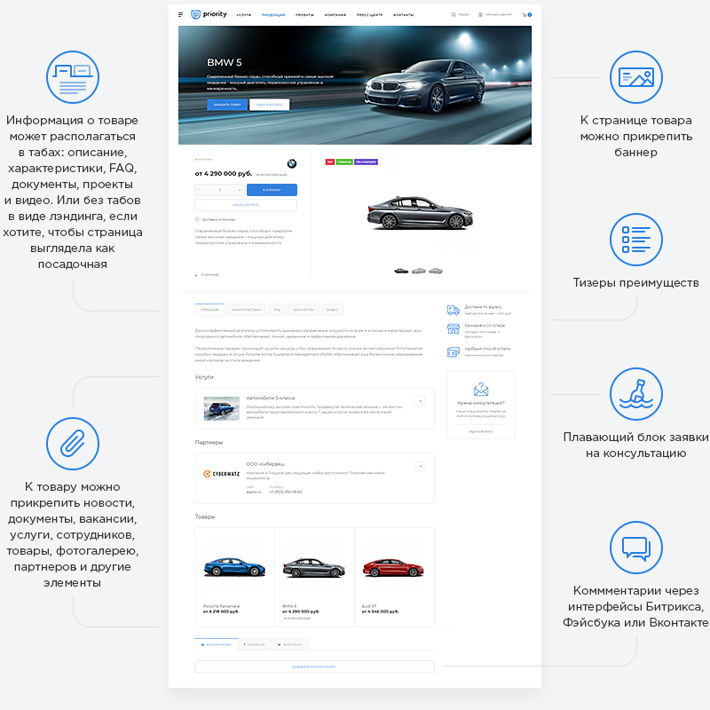 В Аспро: Приорити предусмотрена система гибких связей. С ее помощью вы сможете в несколько кликов собирать детальные страницы из отдельных элементов – отзывов, документов, связанных услуг и товаров – как из конструктора: